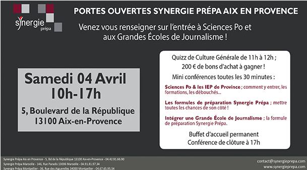 Toute l’équipe des formateurs et des étudiants de Synergie Prépa Sciences Po et Ecoles de Journalisme sont heureux de vous convier à notre « journée Portes Ouvertes » de ce samedi 4 avril, qui se tiendra autour de notre grand quiz de culture générale ouvert au grand public de 11h à 12h, dans nos locaux du 5 bd de la République 13100 Aix en Provence ;